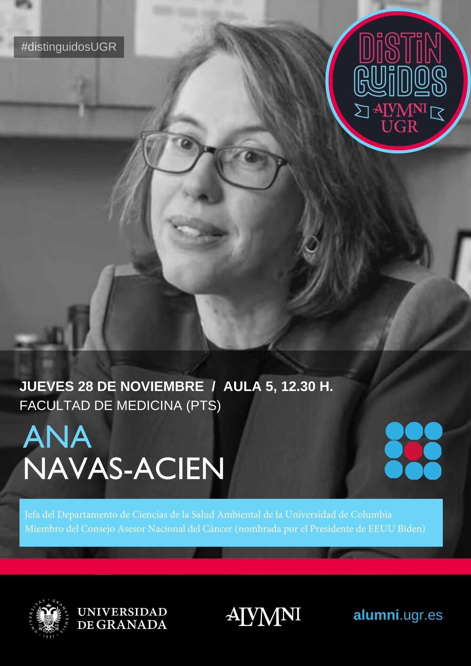 El próximo jueves 28 de noviembre a las 12:30 horas, en el Aula 5 de la Facultad de Medicina, el programa Alumni de la Universidad de Granada contará, en su ciclo de entrevistas de Distinguidas y Distinguidos Alumni UGR, con la intervención de Ana Navas-Acien, Jefa del Departamento de Ciencias de la Salud Ambiental de la Universidad de Columbia y, nombrada por el presidente Biden, miembro del Consejo Asesor Nacional del Cáncer en el Herbert Irving Comprehensive Cancer Center de Nueva York.