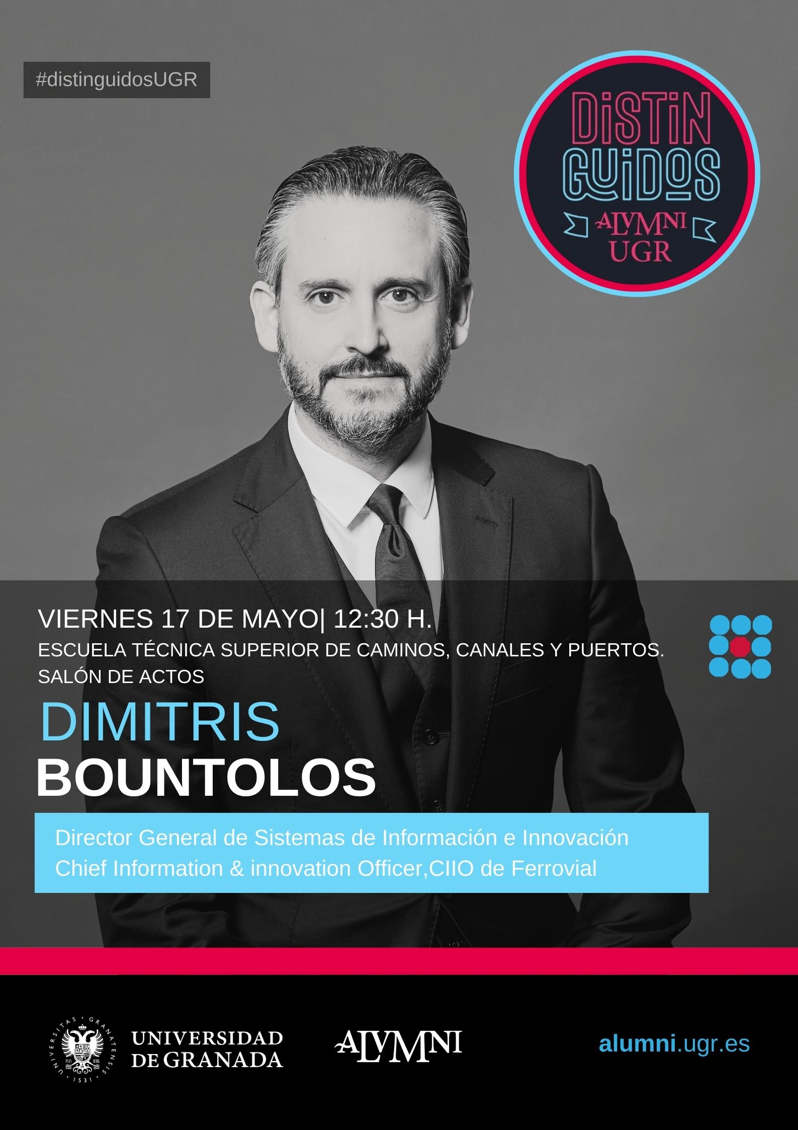 El pasado viernes 17 de mayo, en el salón de actos de la Escuela Técnica Superior de Ingeniería de Caminos, Canales y Puertos, el programa Alumni de la Universidad de Granada contó, en su ciclo de entrevistas “Distinguidos y Distinguidas Alumni UGR”, con la intervención de Dimitris Bountolos,  Director General de Sistemas de información e innovación, CIIO de Ferrovial.